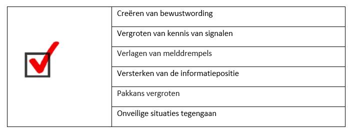 Om echt impact te hebben op de doelgroep is de samenwerking met de wijkpartners in een gebied cruciaal. De campagne versterkt jouw eigen lokale acties in samenwerking met welzijn, hulpverlening of scholen. M. faciliteert en ondersteunt daarbij. De doelgroep moet van meerdere kanten kunnen zien, horen en voelen hoe belangrijk hun melding is. De kracht van herhaling! Houd er dus rekening mee dat je zelf ook moet investeren in het gebied.