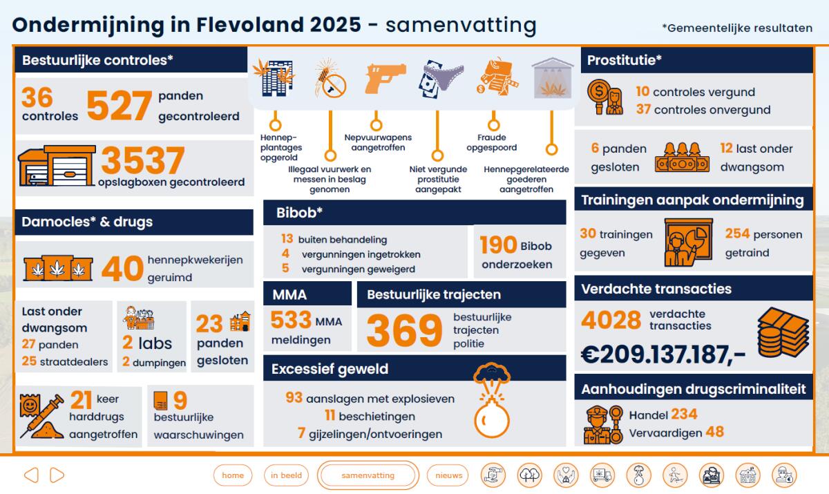 De afgelopen jaren hebben de Flevolandse veiligheidspartners een goede basis gelegd en impuls gegeven op de integrale aanpak van ondermijning. Door op nagenoeg dezelfde wijze het bestuurlijk instrumentarium in te richten en maatregelen te treffen, worden in alle Flevolandse gemeenten en bij de provincie Flevoland dezelfde barrières opgeworpen voor criminelen.